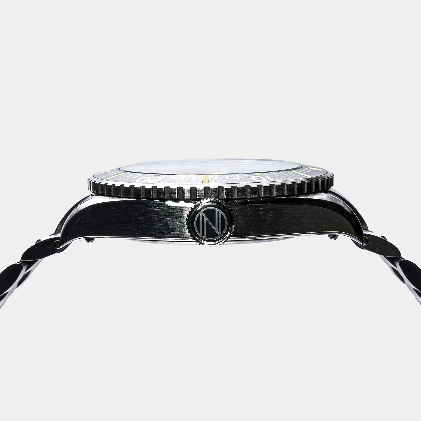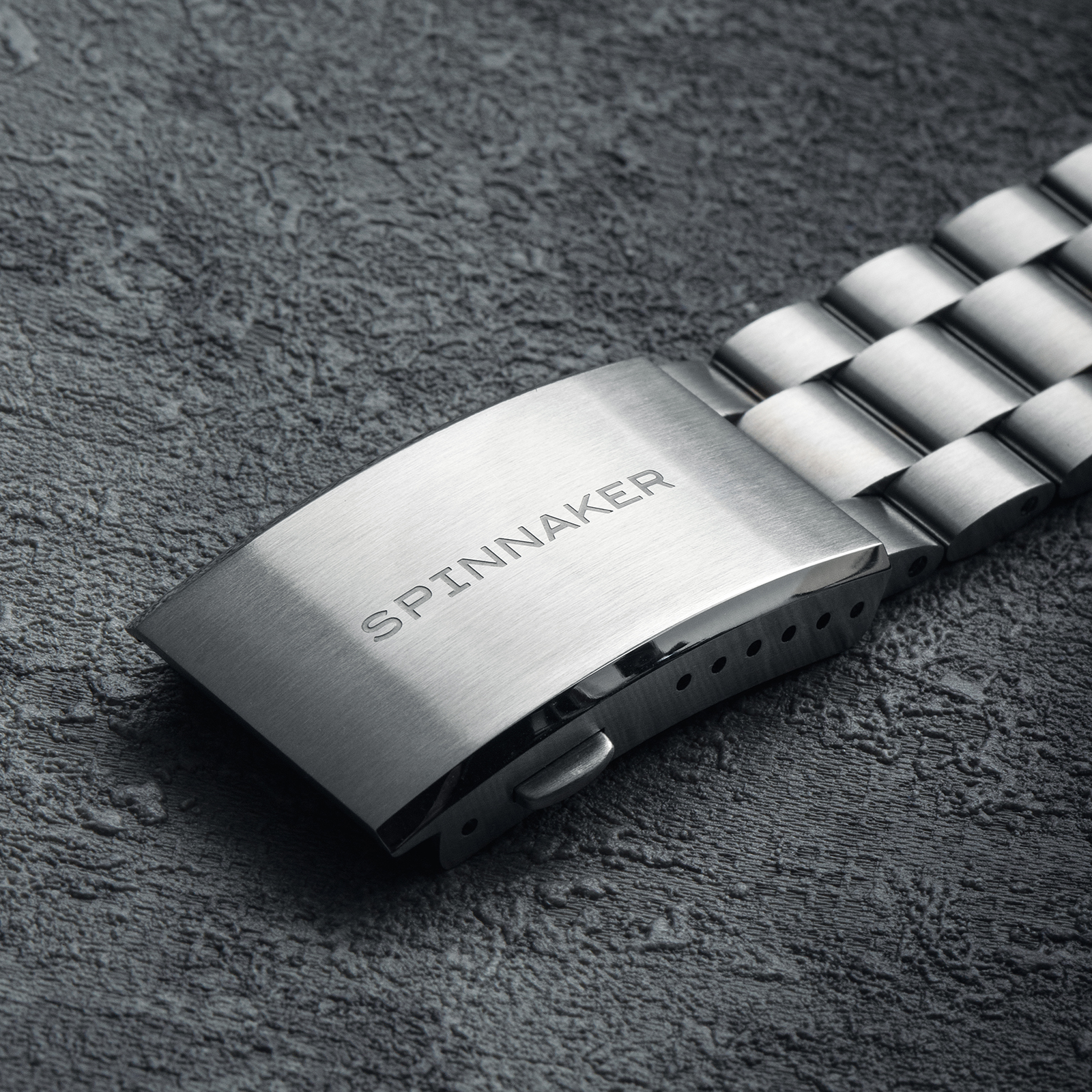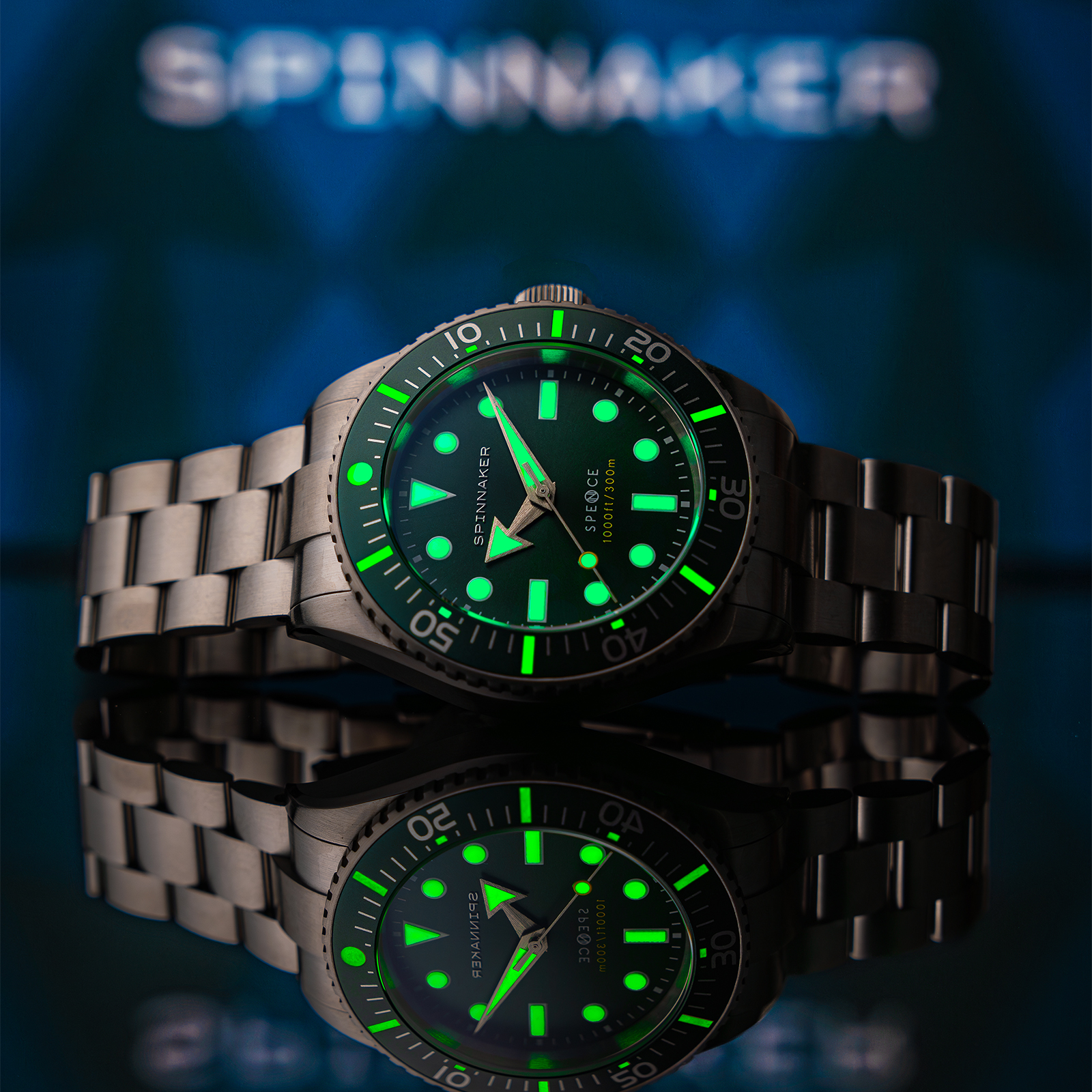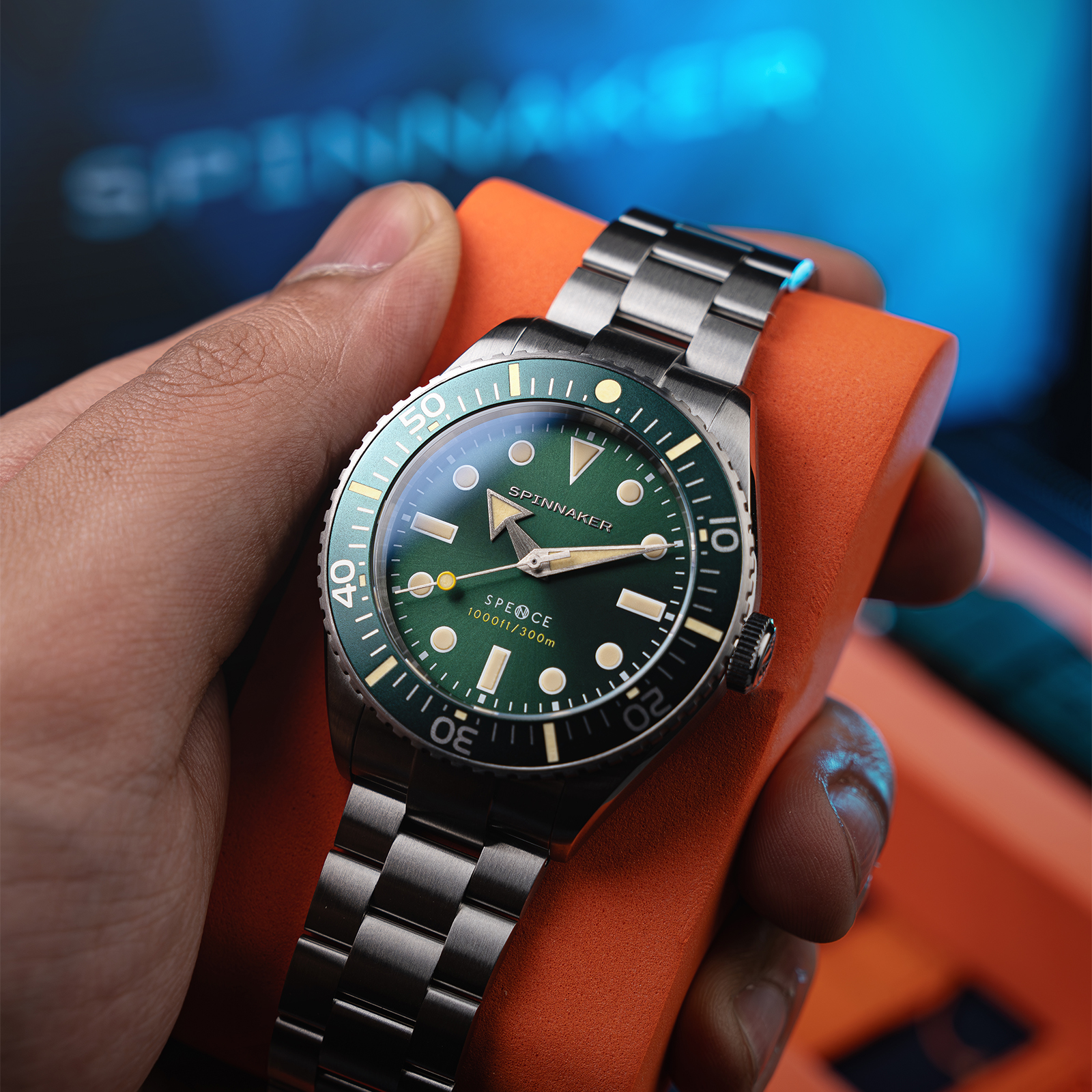 「スペンス300 オートマティック」は、スピニカーが誇る高度な設計と切削技術、職人による丁寧な組み立て技術の結晶です。細部にいたるまで緻密に設計されたパーツが寸分の狂いもなく組み合わさり、300mもの防水性を実現。その上でケース厚10.9mmというスリム化を達成しました。同程度の防水性を叶えるのに、12~14mmの厚みを設けることが一般的なことを考えれば、これは驚異的な薄さです。“ロープロファイル”シルエットでありながら、決して控えめではないポテンシャルを備えています。