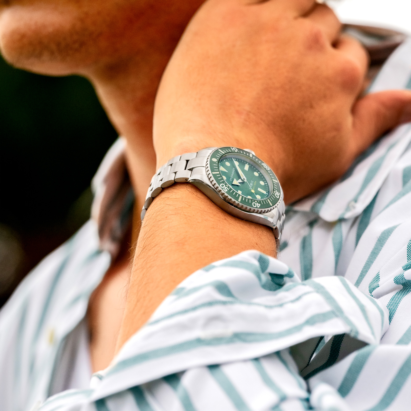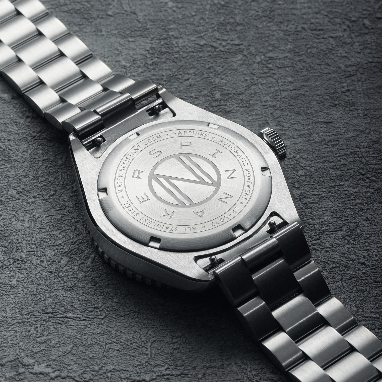 スピニカーの核心的価値、「海を越え、海と生きる」。その実現に欠かせない防水設計技術と、日常的に使用するための実用性を高次元で両立させたのが、「スペンス300 オートマティック」です。11mm未満のスリムケースでありながら300mという驚異的な防水性能を備え、「高防水モデルは厚くなる」という常識を打ち破ります。