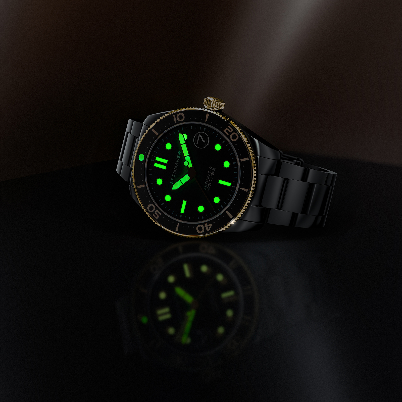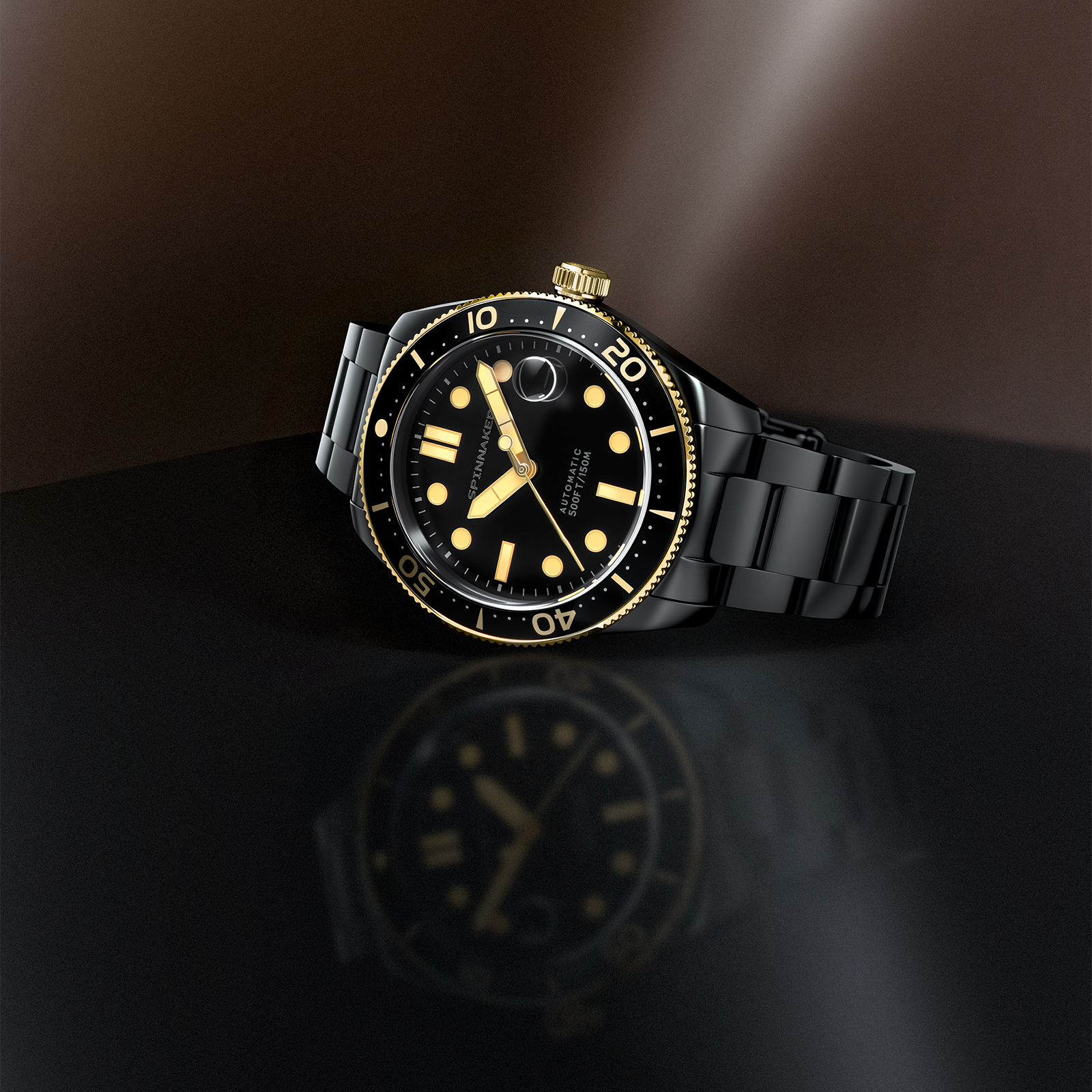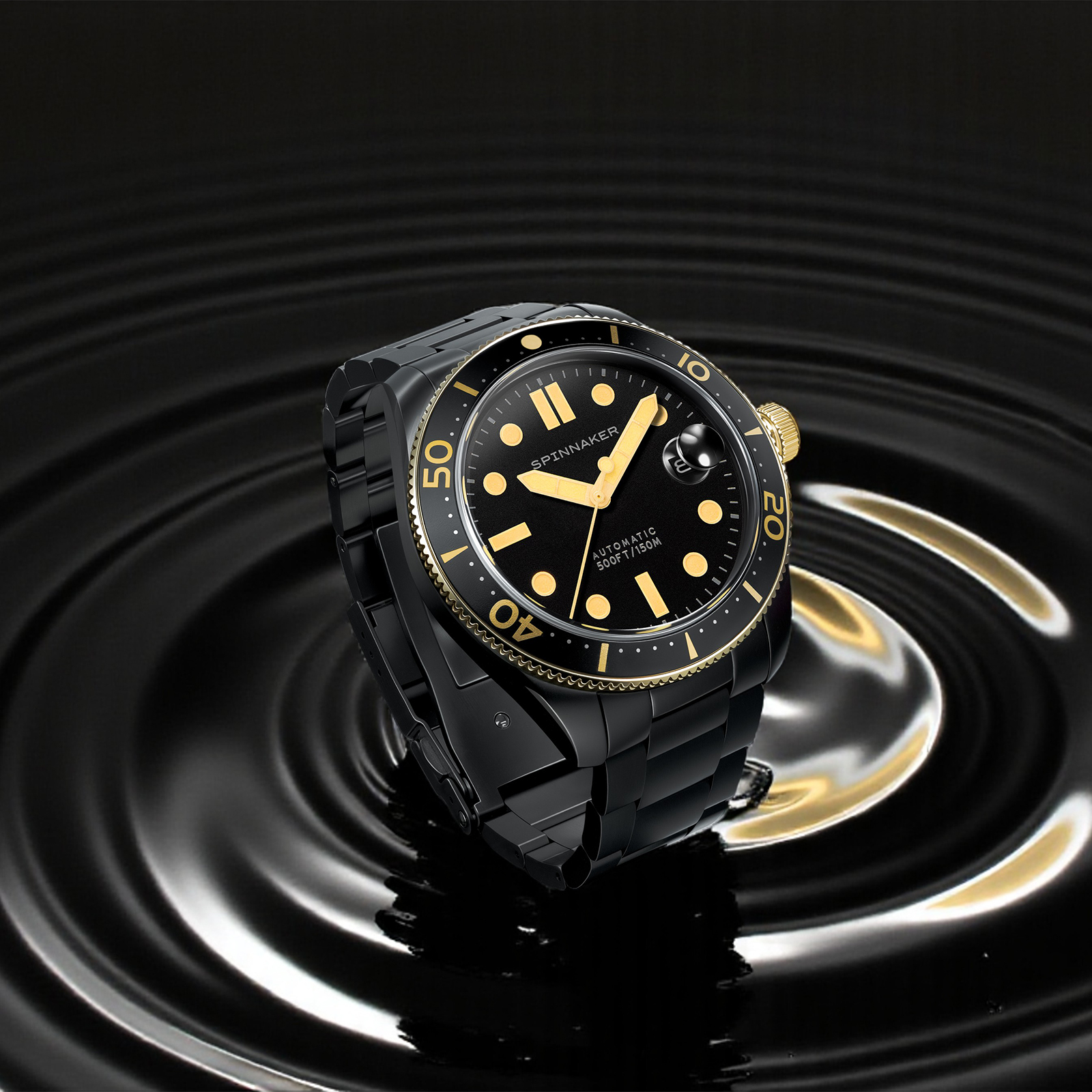 ブラック&ゴールド、そして輝きで再定義されたSPINNAKERの腕時計です。