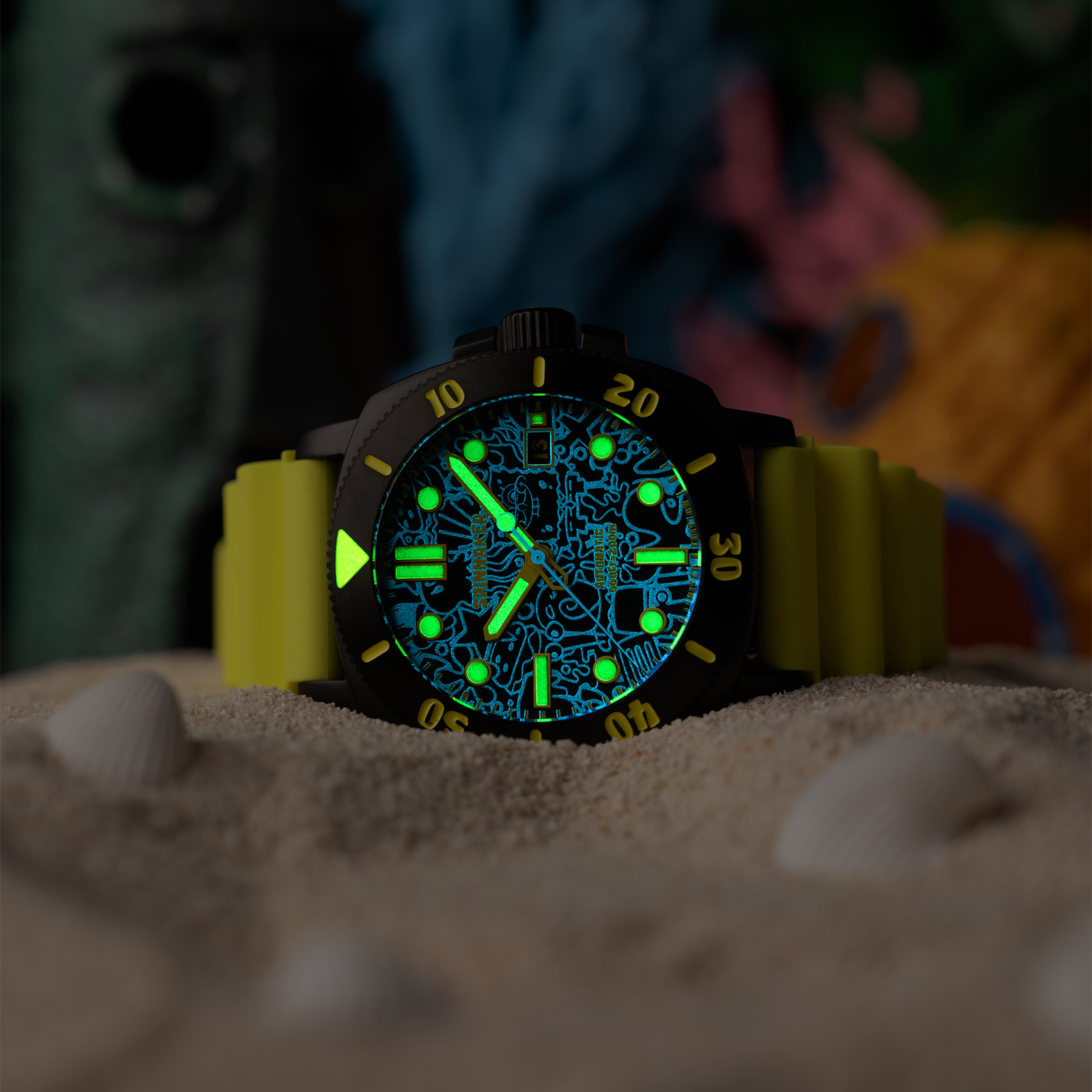 世界で人気のアニメーションシリーズ『スポンジ・ボブ』とのコラボレーション最新作として、ハルオートマティック スポンジボブ リミテッドエディションを発売。 『スポンジ・ボブ』のキャラクターたちをオマージュしたカラーリングや文字盤のグラフィックによって、ゆかいでハッピーな世界観を表しました。