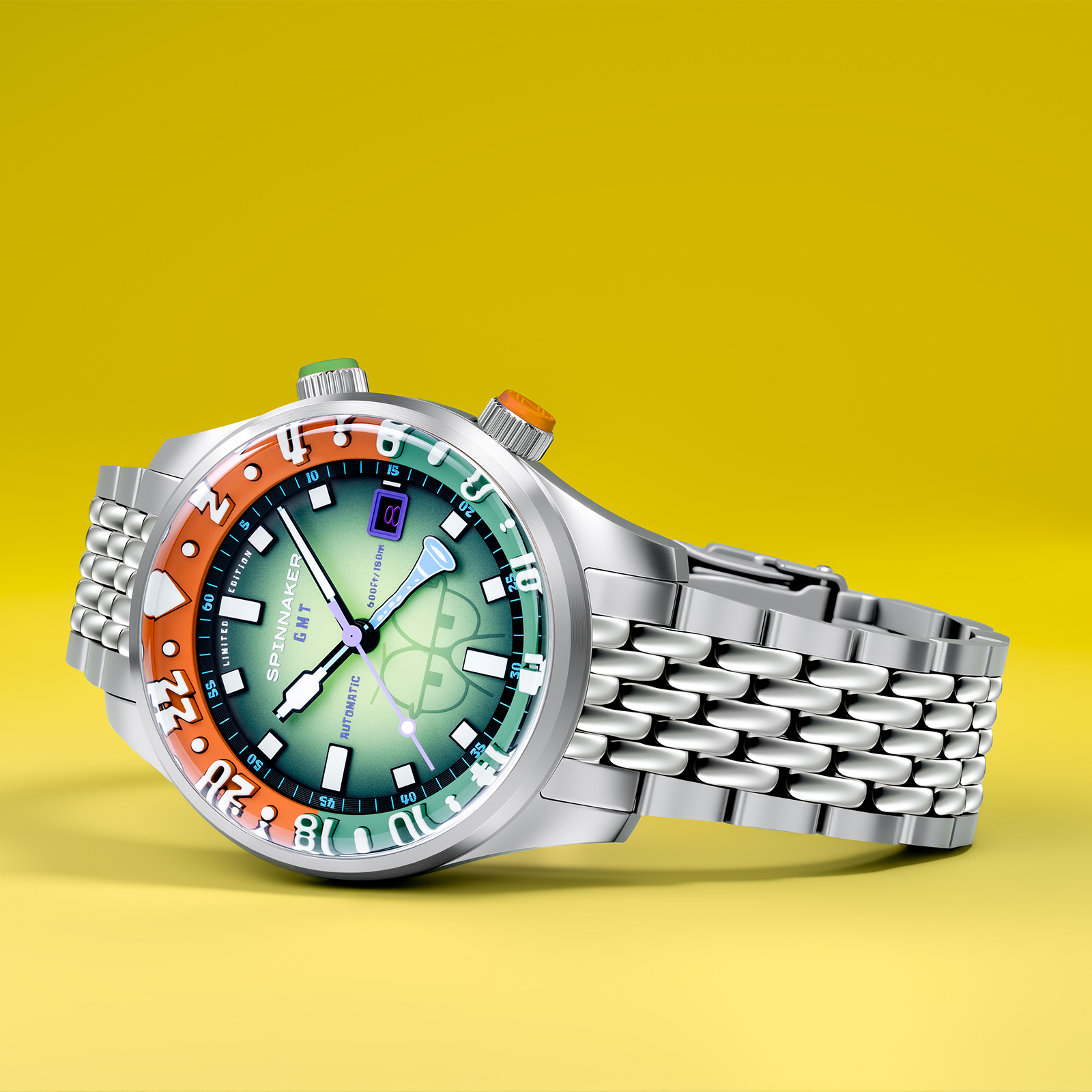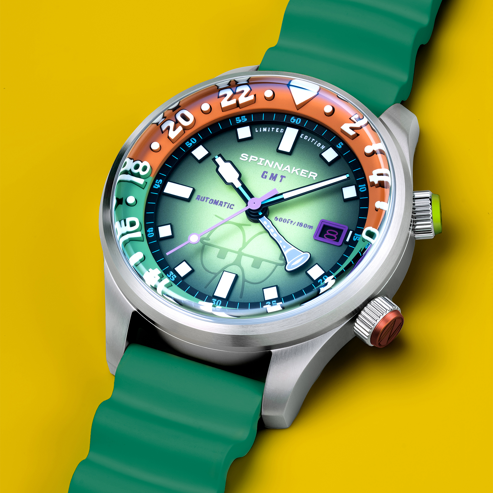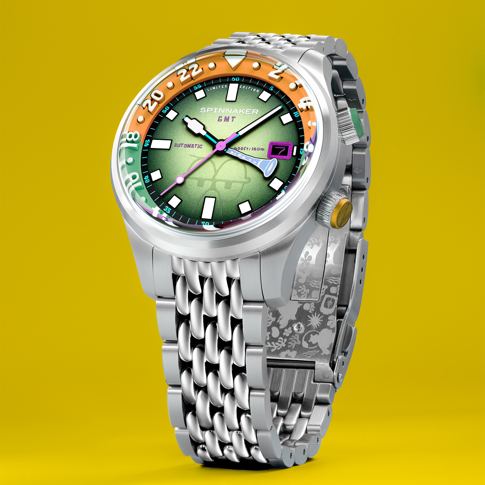「イマジネーション!」を大切にするスポンジ・ボブの理念を、スピニカーは蓄光塗料とGMT針によって表現。