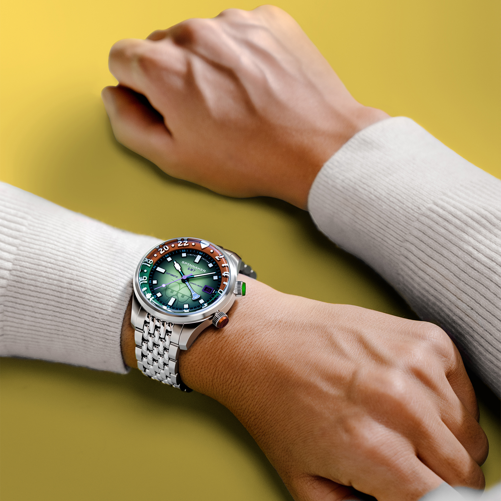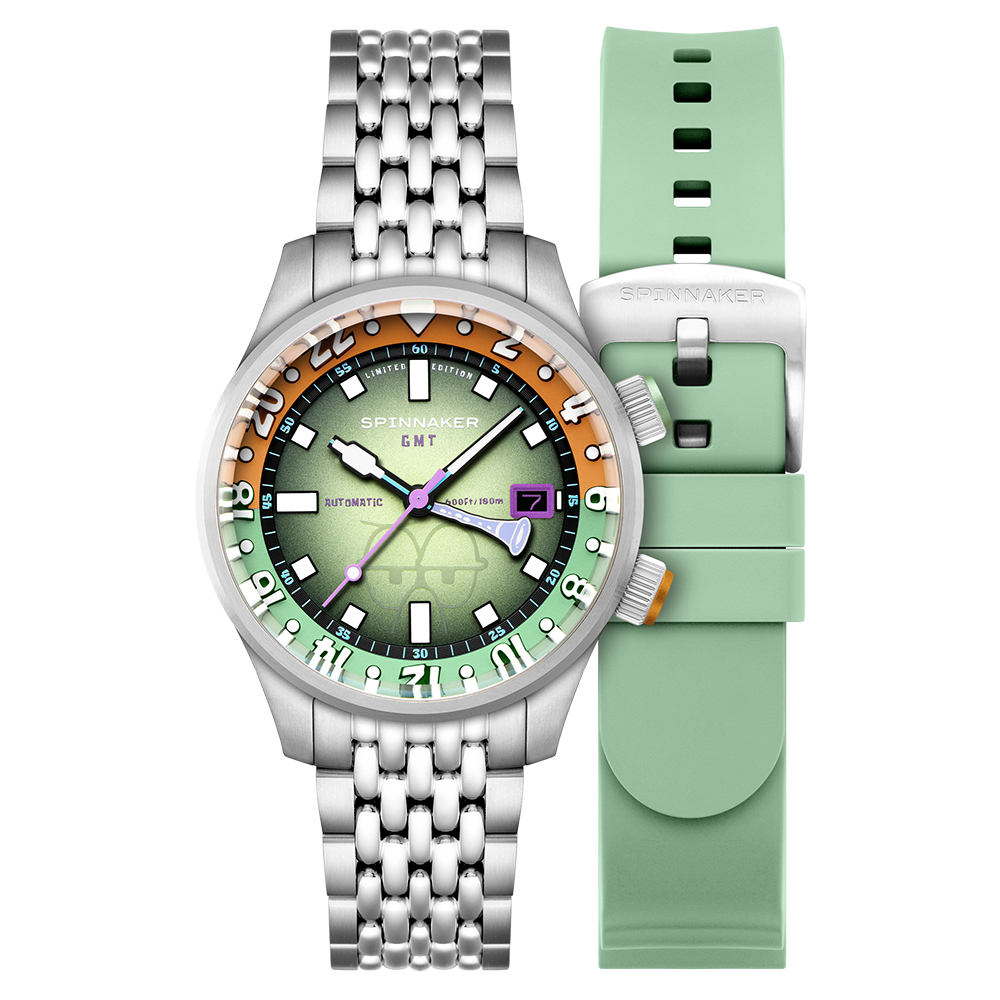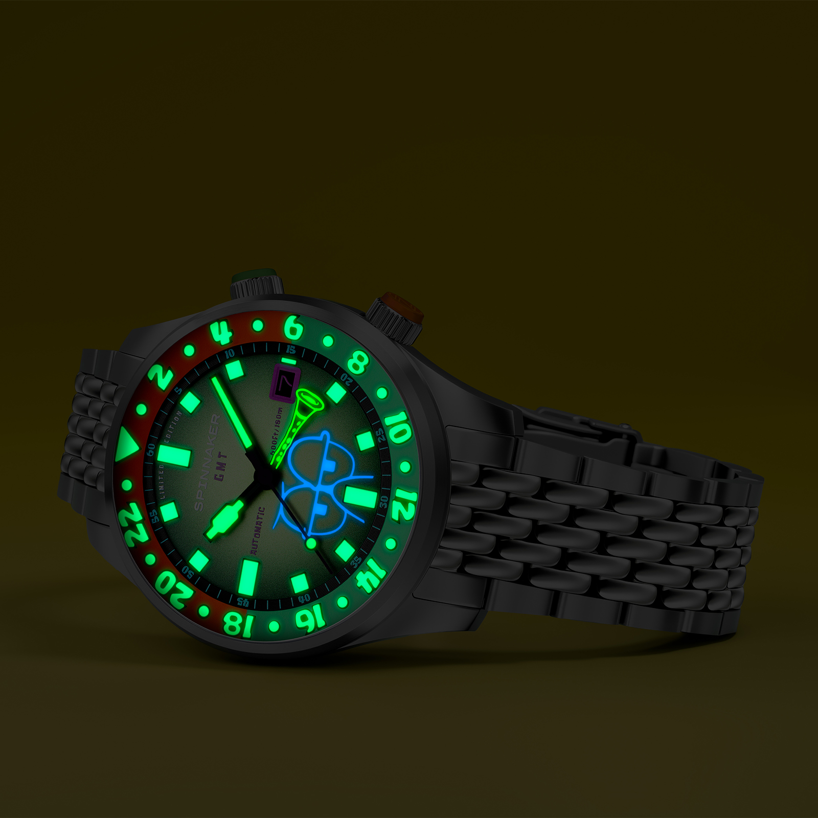 「イマジネーション!」を大切にするスポンジ・ボブの理念を、スピニカーは蓄光塗料とGMT針によって表現。