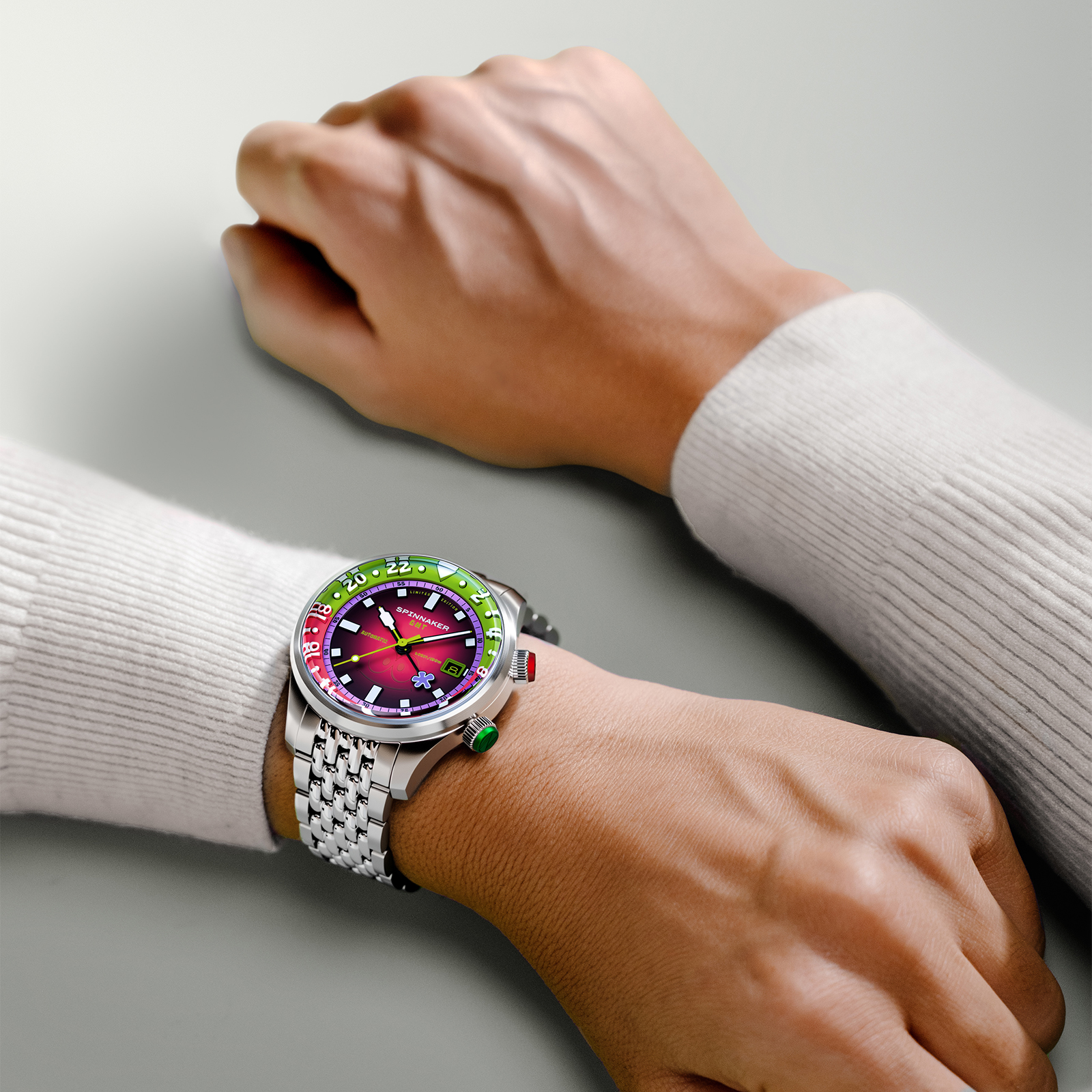 ブラッドナー GMT オートマティックの特徴のひとつは、インナーベゼルが回転するコンプレッサーケース。1950年代に登場した歴史深い機構であり、2時位置にあるリューズを回すと、ケース内部のインナーベゼルが回転する仕組みです。高い気密性を維持したままインジケーターとしての機能を付与でき、多くのダイバーズウォッチに利用されてきました。ベゼルは昼夜を分かつ2トーンで彩られ、キャラクターを象徴するカラーを採用しています。
